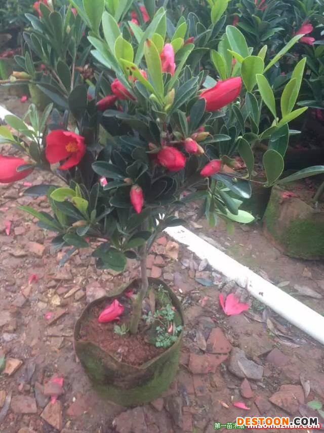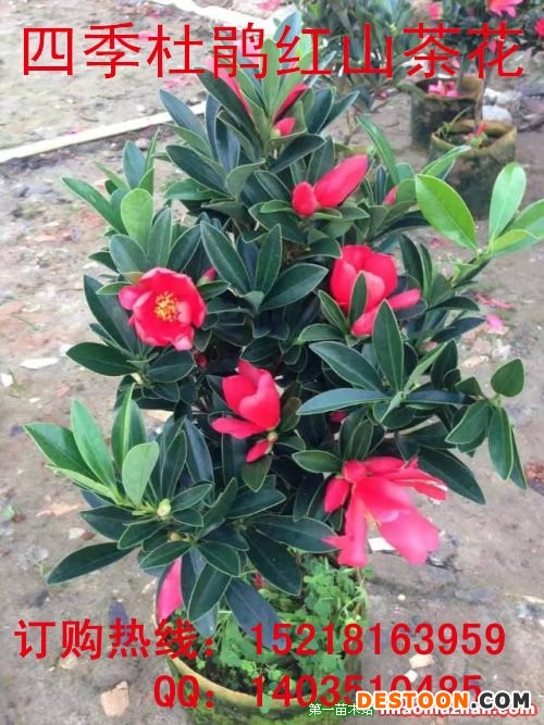 形態特征 常綠灌木,高1~2.5m,目前**高可達5m,冠幅0.5~1m,**大胸徑約5.8cm。陰生或半陰生,1年可以抽梢3~4次,株型緊湊,分枝密,嫩枝無毛,略顯紅色,老枝光滑,灰褐色。葉倒卵形、長倒卵形及倒心狀披針形,先端園鈍或者稍微有凹陷,基部楔形;葉上表面光亮碧綠,下表面淺綠色,兩面均無毛,稍被灰粉;側脈5~8對,干時兩面稍可見,中脈兩面突起;葉全緣,有時見葉尖端有2~5對鋸齒,邊緣具透明骨質狀狹邊,呈互生或輪生,多聚集于枝梢上部;葉柄長0.6~1.2cm,無毛。抽芽時可見先出葉多枚(7~8枚),...片真葉至頂葉葉間距逐漸變短,枝頂往下基本一腋一花,每梢生1~8個花芽,花艷紅色或粉色,無花梗;花在枝上自下而上漸次開放,整個植株形成連續開花的現象。花瓣5~9枚,柱頭2~5裂,雄蕊外輪連成桶裝。鱗片7~11枚,子房卵形無毛,果為蒴果,呈卵球形、紡錘形或圓錐形,2~4室,每室2粒種子,成熟時果皮由青色變成褐黑色或棕色,果實裂開。 生長習性 杜鵑紅山茶生森林茂密、人煙稀少的小溪兩旁。生長區年平均溫度22.1℃,**高溫38.4℃,**低溫-1.8℃,七月平均溫28.2℃,一月平均溫14.3℃。年日照時數1200小時,無霜期350天。年平均降雨量3428.9mm,相對濕度85%。成土母質為花崗巖,紅壤,土壤pH5.5-6。杜鵑紅山茶一般分布在林冠下層,為半陽性樹種,較為耐陰。 主要價值 杜鵑紅山茶是一種觀賞價值極高的名貴木本花卉品種,以其花大、鮮艷、葉片獨特、樹冠優美的特征吸引了眾多園林科研工作者的眼球。 杜鵑紅山茶的株型與葉形特點也決定了杜鵑紅山茶在園景樹、花籬、盆景及切花等方面均有較好的開發前景。 杜鵑紅山茶因其外形極像杜鵑,實質卻是山茶,故此得名。普通的山茶花既有傲梅風骨,又有牡丹艷麗,自古以來就是極富盛名的木本花卉,有“世界名花”的美名。而杜鵑紅山茶的美艷比普通的山茶有過之而無不及。