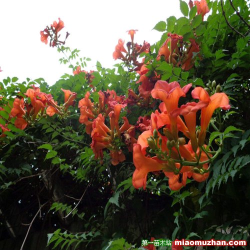 美國凌霄原產北美洲,與上種主要區別在于小葉7一15片,多數11一13片,葉脈及葉柄上多細柔毛;花序繁茂緊密,但花冠較小,花徑約3-4厘米,深橙紅色;花筒較短,萼筒棕紅色,質厚光滑無棱,裂得也較淺。在南京花期為6月-10月。紅花凌霄樹苗價格表參考