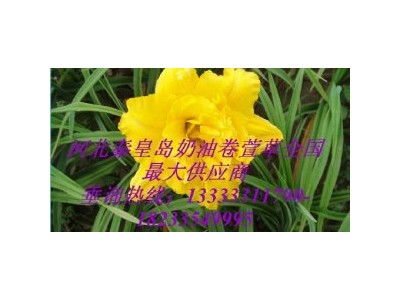 奶油卷萱草;葉綠色,寬1~2cm,花梗粗壯,高45cm左右。花重瓣,金黃色,花朵碩大,直徑可達8~10cm,每株可著花6~8朵,花期6月中旬至8月中旬,花色鮮黃艷麗,令人目不暇接,也是園林綠化工程地被首選品種,它屬于高端草花系類,系國外引進,國內數量還較少,是發展宿根花卉產業的王者,也是地被宿根花卉的王者,奶油卷萱草的所有權;萬源博輝宿根花卉繁育基地。