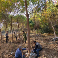【烏桕種植管理】移栽時須帶土球,土球直徑35至50厘米。因城市中土壤條件較差,栽植時要堅持大塘淺栽,挖1米×1米×1米的大塘,清除塘內(nèi)建筑碴土等雜物,在塘底部施入腐熟的有機肥,回填入好土,再放入苗木,栽植深度掌握在表層覆土距苗木根際處5至10厘米。栽后上好支撐架,再澆一次透水,三天后再澆一次水,以后視天氣情況和土壤墑情確定澆水次數(shù)一般10天左右澆一次水。